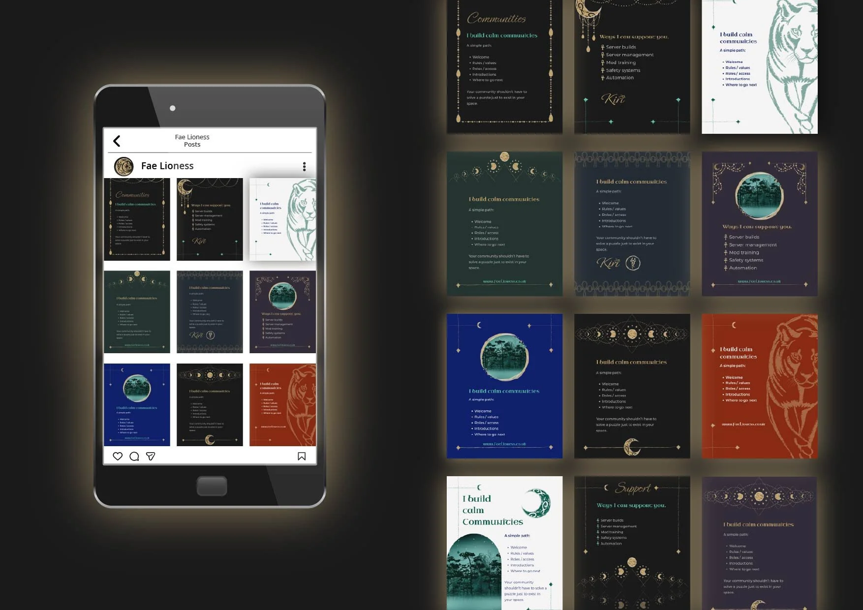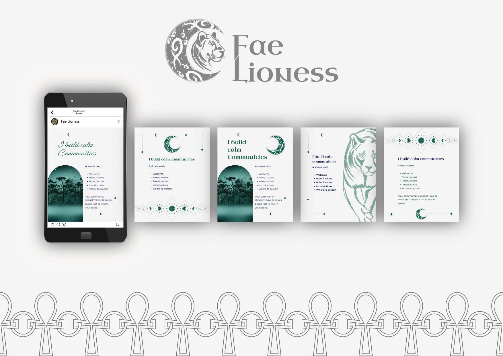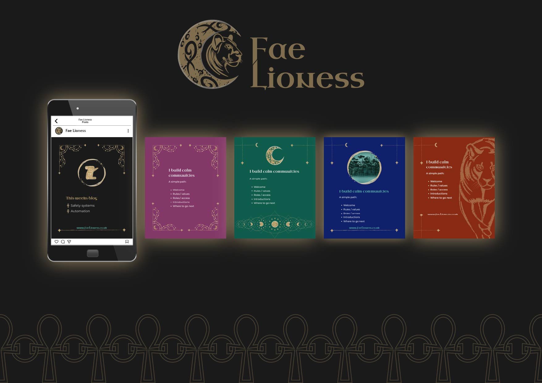 Logo files in print and digital formats, a full set of brand assets including all the patterns and shapes, 12 social media post templates and a carousel, an onboarding document, Facebook and LinkedIn headers, and brand guidelines written in plain English - no corporate speak, just practical advice on layout, design, and what to avoid. The guidelines are built in Canva too, so as Fae Lioness grows there's always room to expand.