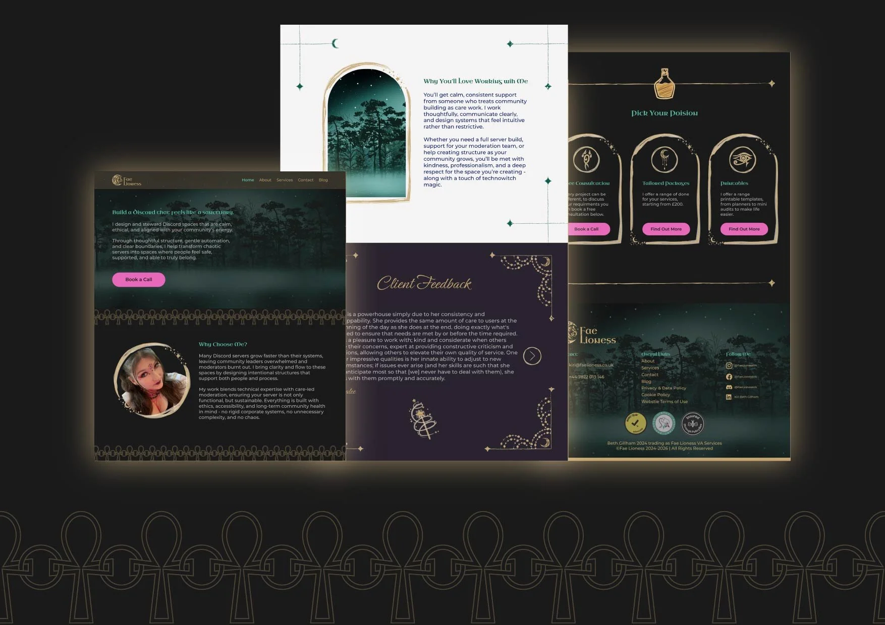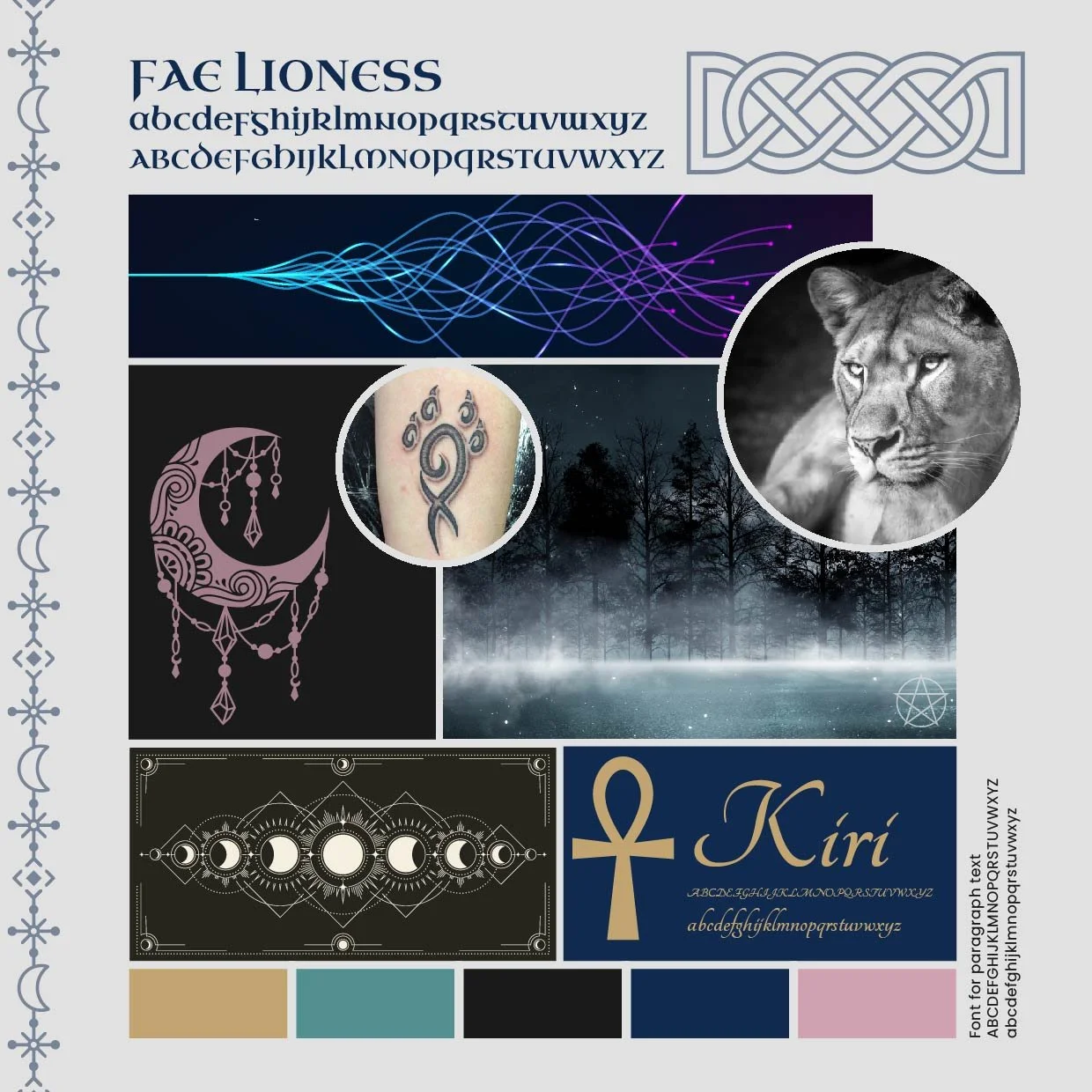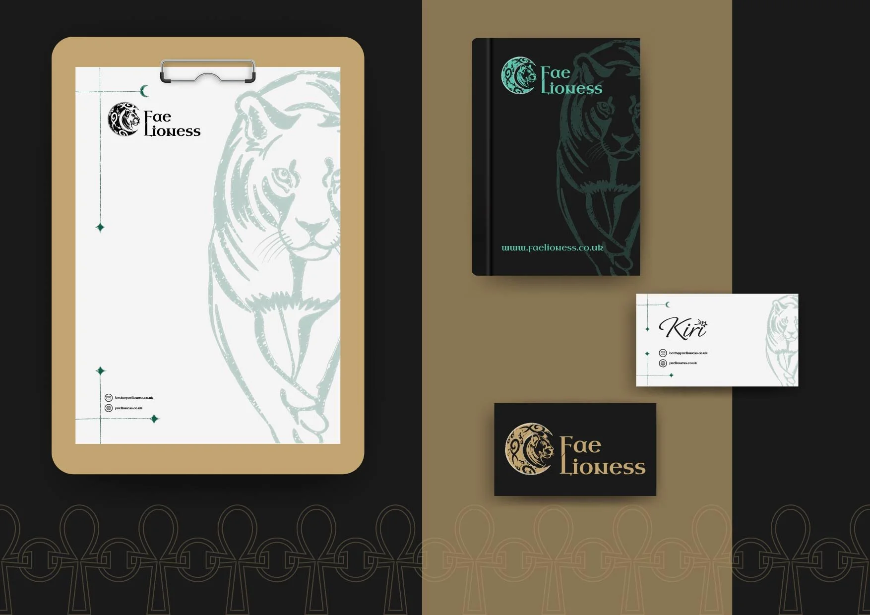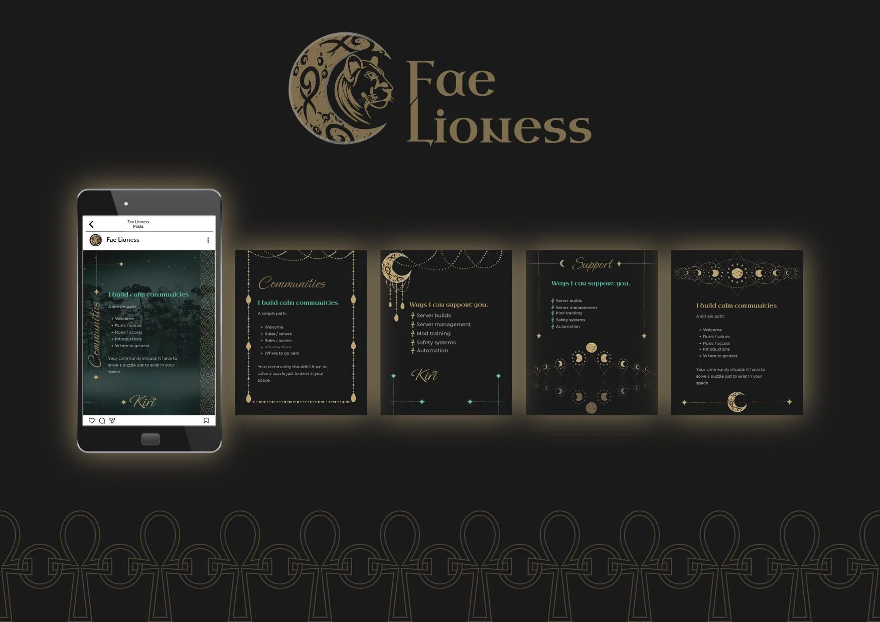 Kiri had seen the brand work I'd done for Alexis Bushnell - particularly the stickers - and knew she wanted something similar for her own brand. A full identity for Fae Lioness that captured all of who she is: the Egyptian mythology, the witchy aesthetic, the goth edge, the community warmth. And those stickers.