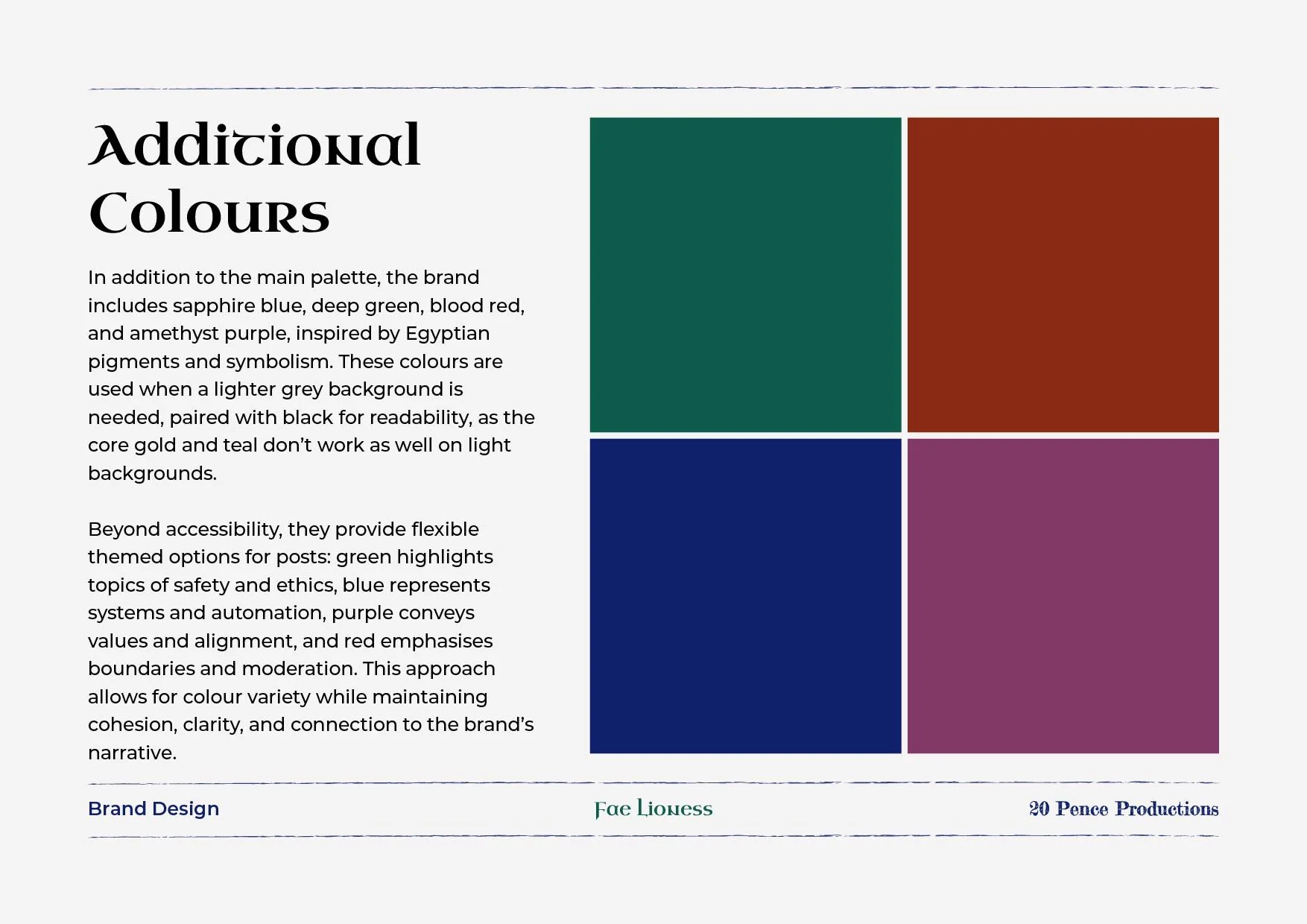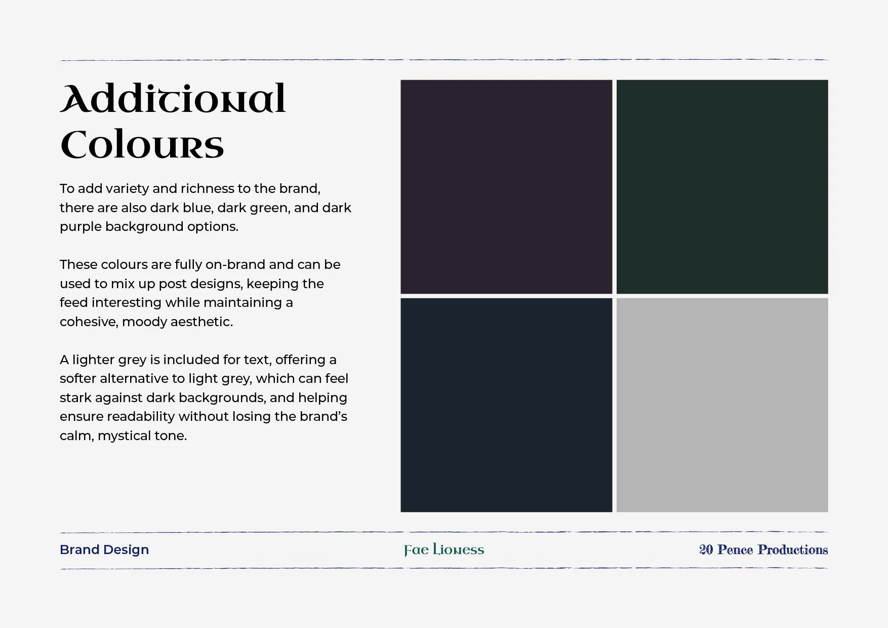 We carried on - through the thinking behind the design, the logo variations, the colour system. Rather than just only black, I'd built a palette including deep greens, purples, and blues, with a lighter option to break things up, and four specific colours for different types of content posts. The idea was to give Kiri genuine creative freedom while keeping a system underneath that made everything feel cohesive and easy to use.