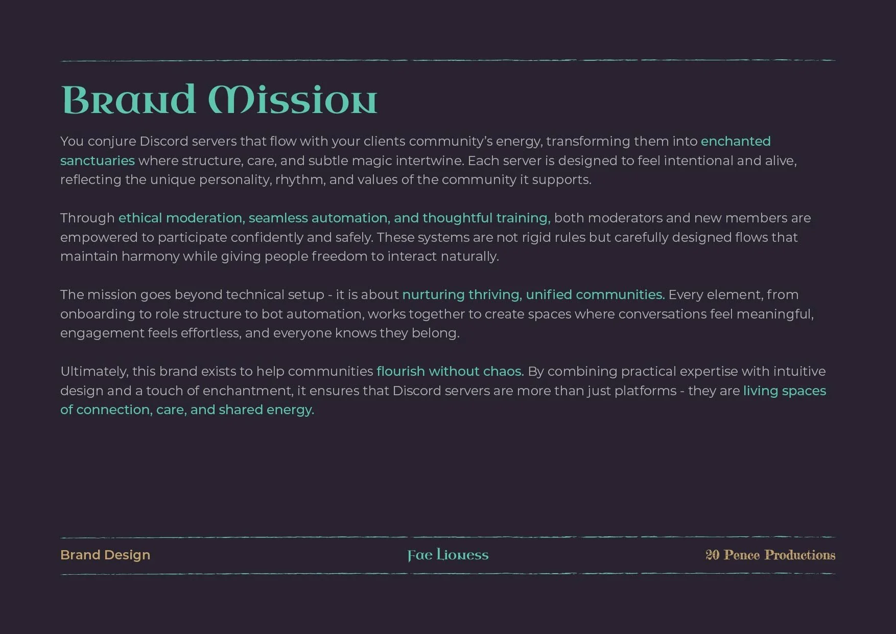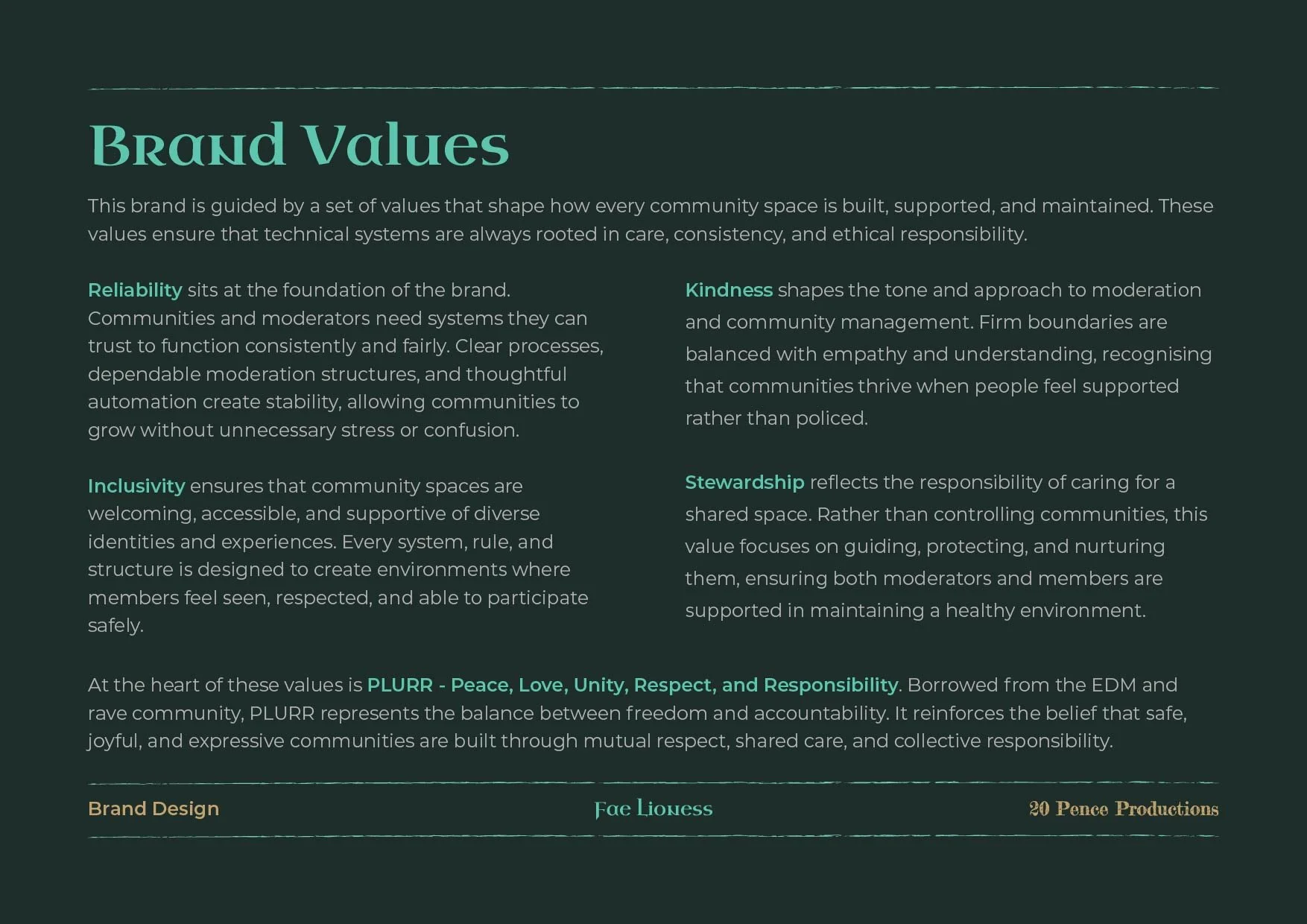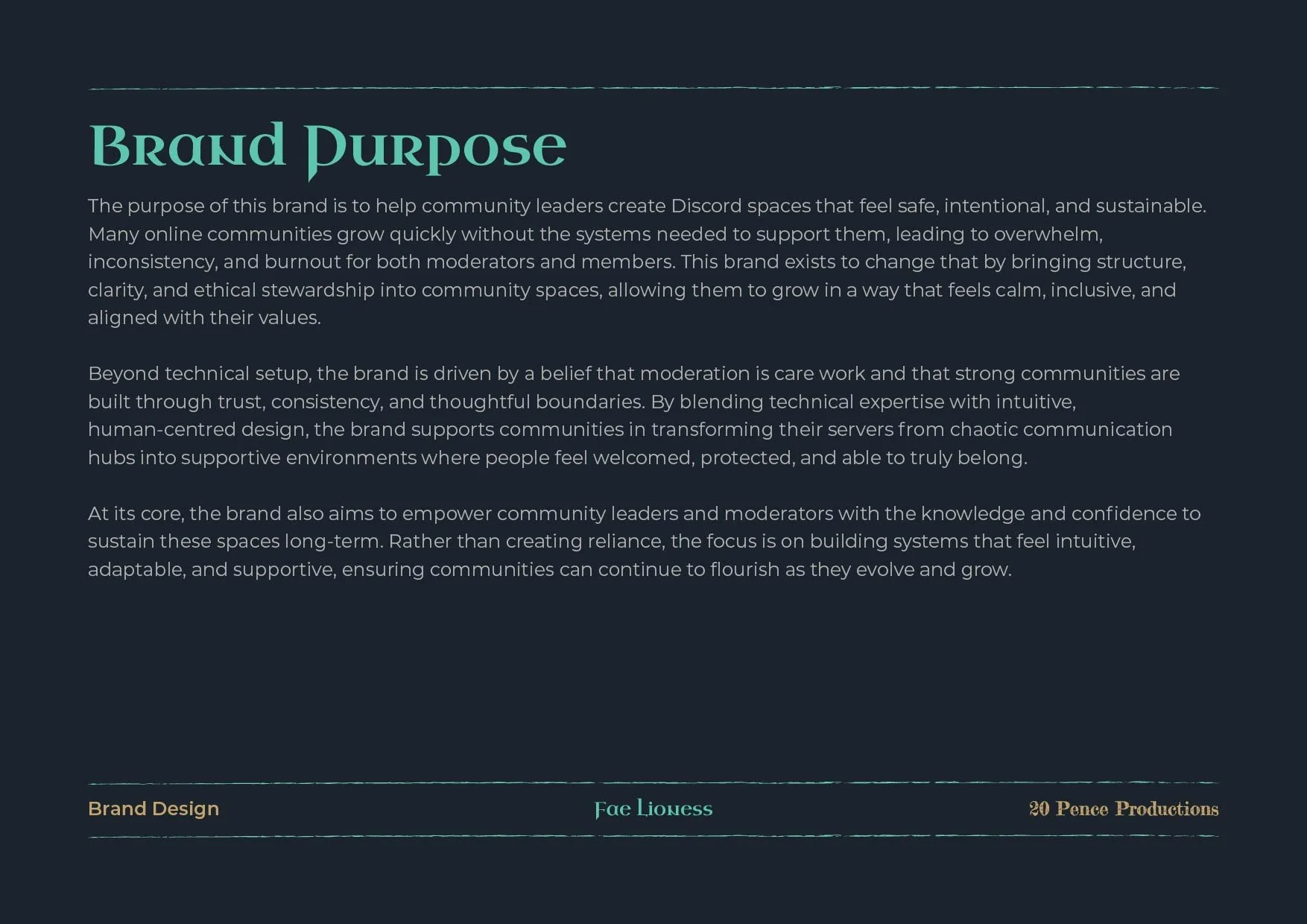 We went through the brand introduction together - mission, purpose, values, all drawn directly from what Kiri had shared. The first few pages had a nod to what was coming, and before we'd even reached the logo she said: “I love it already.”