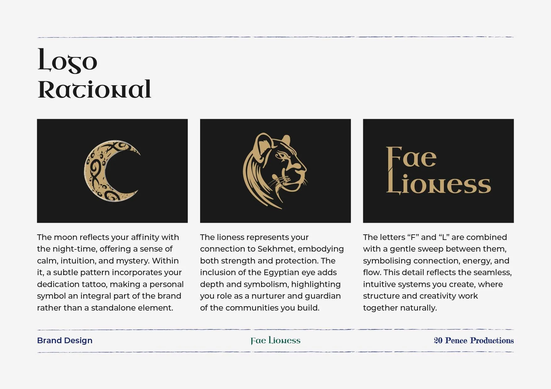 I linked the F and L of Fae Lioness together with a flowing line between them, then turned my attention to the lion. I wrestled with it for a while - was a lion too obvious? But knowing how central Sekhmet was to Kiri, I decided to give it a proper go. I worked on it, added an Egyptian eye which looked good, played with a part-moon shape for flow - but something still wasn't quite landing. I stepped away, came back, and added what I can only describe as a swoosh. Yes, very technical. But it gave the design exactly what it needed.